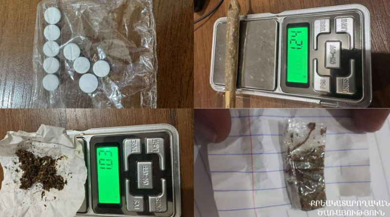 Մարտի 13-ին ժամը 23:30-ի սահմաններում Արցախի պողոտայում ապօրինի թմրամիջոցներ ձեռք բերելու, պահելու և իրացնելու կասկածանքով ձերբակալվել են 40 և 41 տարեկան երկու տղամարդ։ 41-ամյա տղամարդու անձնական խուզարկության արդյունքում հայտնաբերվել են տարբեր տեսակի թմրամիջոցների նմանվող զանգվածներ, այդ թվում՝ մեթամֆետամին, հաշիշ, հերոին և ափիոն։