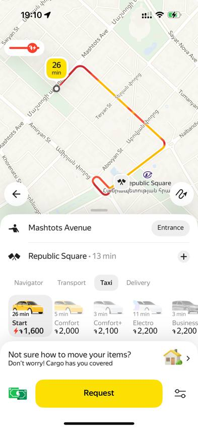 Օրինակ, Մաշտոցի պողոտայից Հանրապետության հրապարակ հասնելու համար YandexGo հավելվածում Start-ը արժե 1600 դրամ։