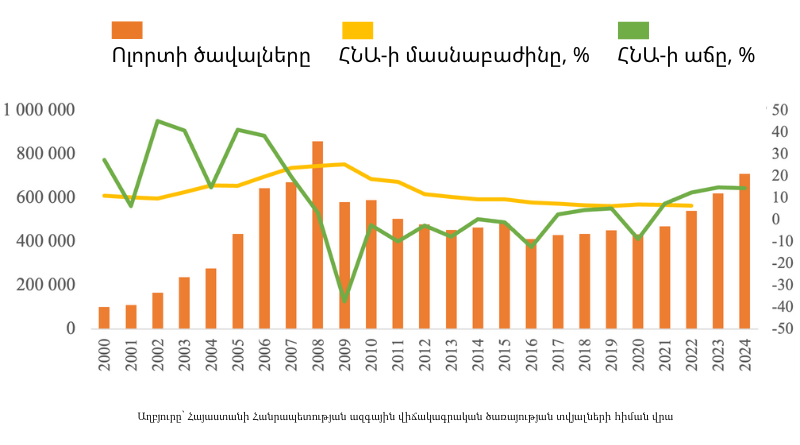 Վերջին 20 տարում շինարարության ոլորտը անցել է զգալի տատանումների միջով։ 2008-ին այն հասել է իր պատմական առավելագույնին՝ 858.6 միլիարդ դրամ։ Սակայն 2009-ին արձանագրվել է սուր անկում՝ շուրջ 40 տոկոսով։ Այս անկումը պայմանավորված էր գլոբալ ֆինանսական ճգնաժամով, որն իր ազդեցությունն ունեցավ ինչպես պահանջարկի, այնպես էլ ֆինանսավորման վրա։