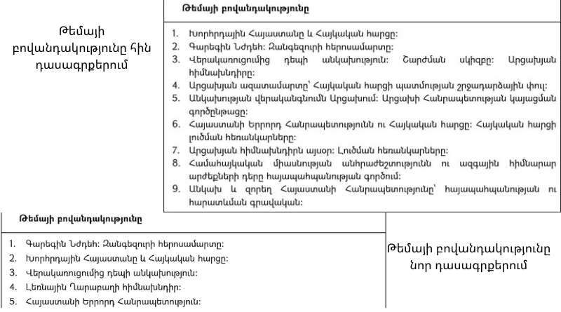 Կրթության, գիտության, մշակույթի և սպորտի նախարարության հրապարակված հրամանի մեջ կարելի է տեսնել, որ նոր դասագրքերից ջնջվել կամ վերաձևակերպվել են մի շարք թեմաներ, որոնք վերաբերել են հայապահպանությանը, ազգային ինքնությանն ու միասնականությանը։