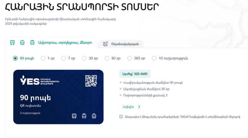 During a working session of the Yerevan Municipality, Mayor Tigran Avinyan introduced the website transport.yerevan.am, designed for the unified ticketing system. Through this website, users can explore ticket packages, use a calculator to determine the most affordable ticket option, and more. In the “Privileges” section, users can enter their Public Service Number (PSN) to check whether they fall into any privileged groups.
