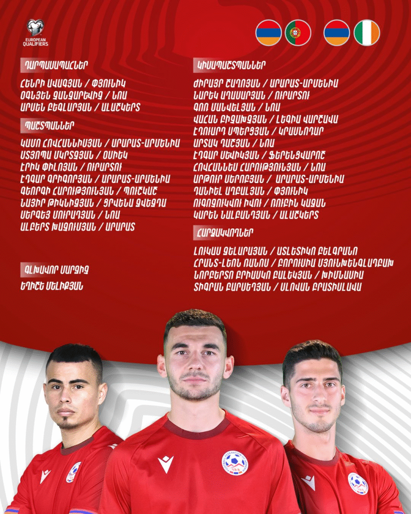 Главный тренер сборной Армении по футболу Егише Меликян опубликовал список футболистов, вызванных в национальную команду перед матчами отборочного турнира чемпионата мира 2026 года с Португалией и Ирландией в европейской зоне.