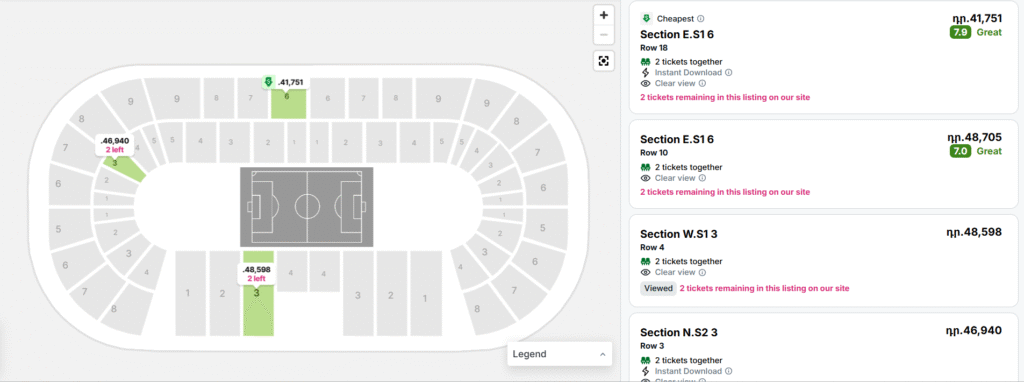 Այս պահին վաճառվող ամենաթանկ տոմսը արևմտյան տրիբունայում է, որն արժե 48,805 դրամ։ Ամենաէժան տոմսը վաճառվում է արևելյան տրիբունայում՝ 41,751 դրամ։ Հետաքրքիրն այն է, որ հանդիպման տոմսերի արժեքը եղել է արևմտյան տրիբունայում՝ մինչև 5-16 հազար դրամով։ Արևելյան տրիբունայում տոմսերն արժեցել են 5-10 հազար դրամ, իսկ հյուսիսային ու հարավային տրիբունաներում՝ 1000-3000 դրամ։ Վերավաճառողները շուրջ 5-10 անգամ թանկ են վաճառում տոմսերը։ Այս պահին վաճառքի դրված է 8 տոմս։